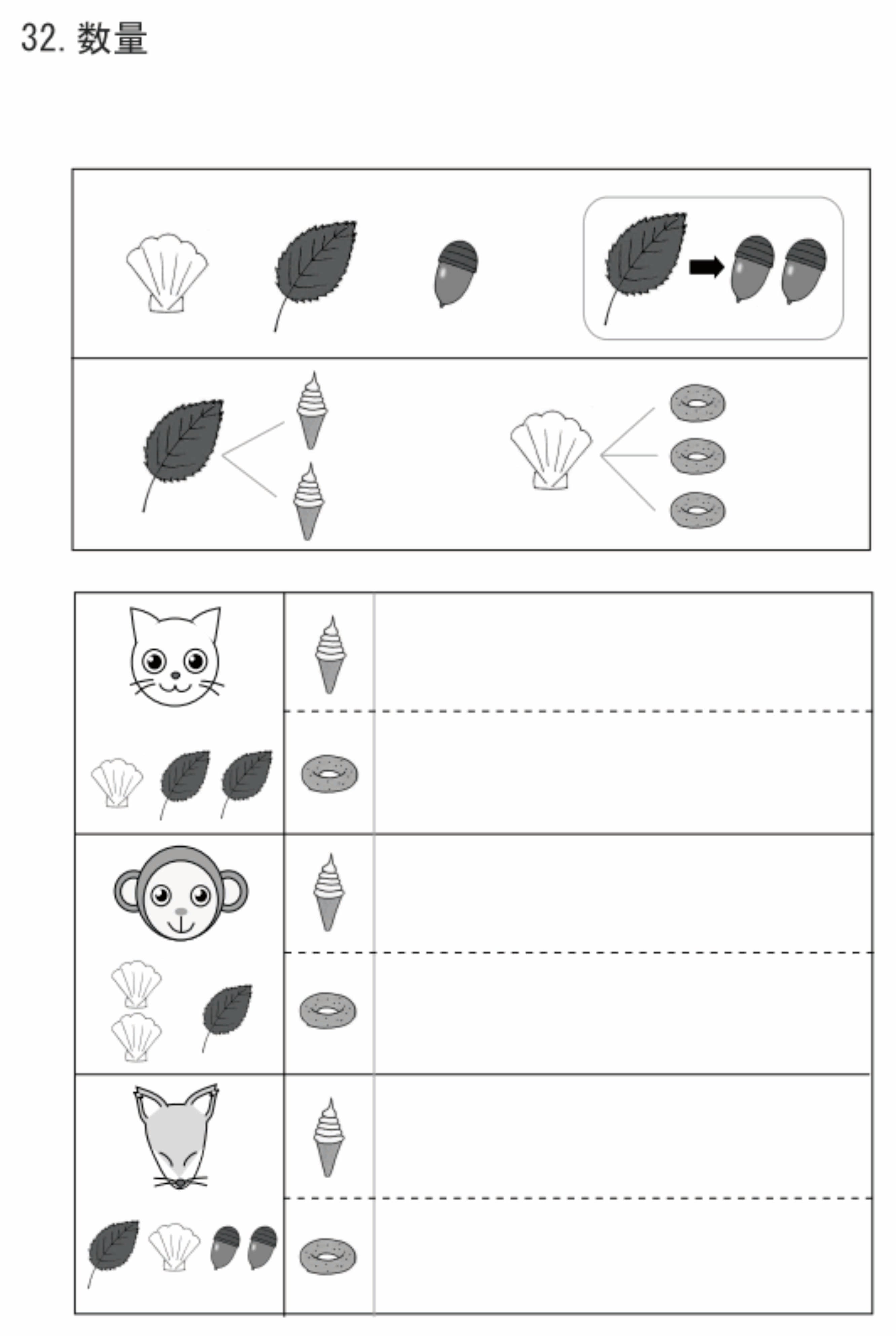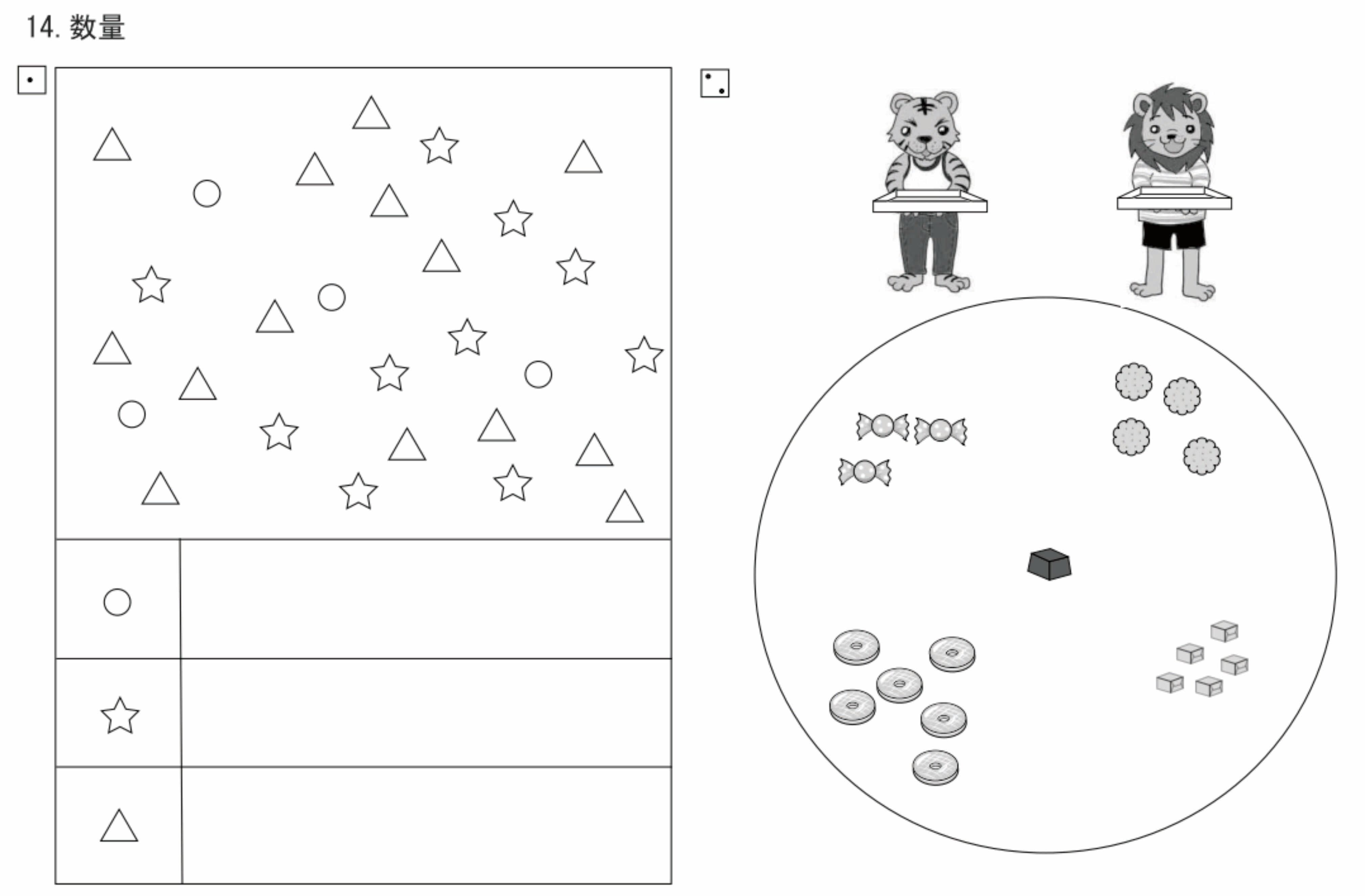 第4集は数量分野の物の数を数える・分割・その他の問題を集めています。物の数を数える問題は毎年出ますので、必須の問題といえます。その次に良く出題されるのが分割の問題です。それ以外は長さ比べ・広さ比べ・水の嵩・置き換え等の問題とシーソー・天秤です。