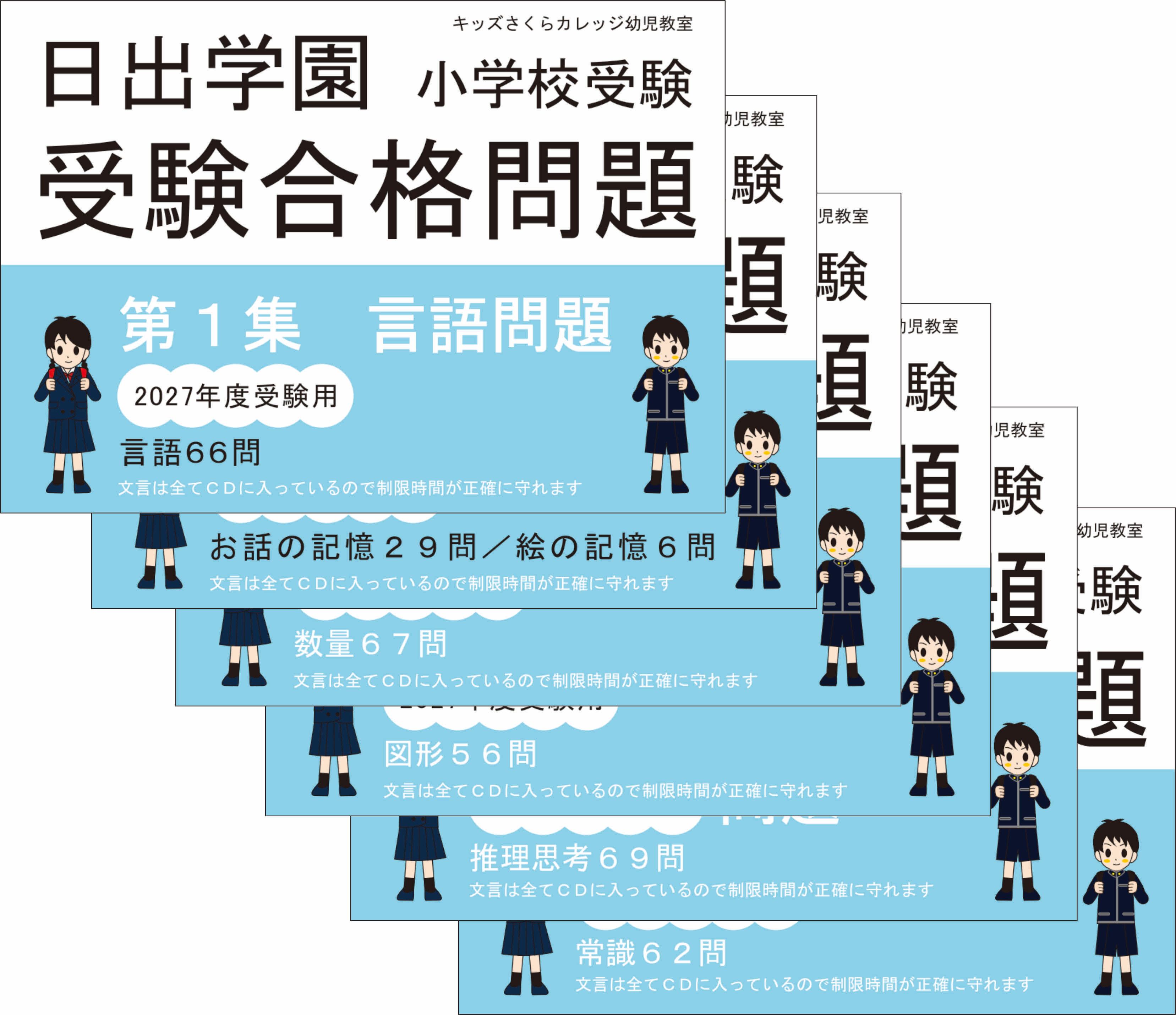 入試過去問題を分析して効率よく実力をつける問題集を作りました。日出学園小学校を受験する子供たちに最適の問題集です。第1集「言語」、第2集「記憶」、第3集「数量」、第4集「図形」、第5集「思考」、第6集「常識知識」の6巻セットになります。文言は全て音声CDに入っているので、保護者が問題を読んであげる必要がなく、制限時間が正確に測れます。