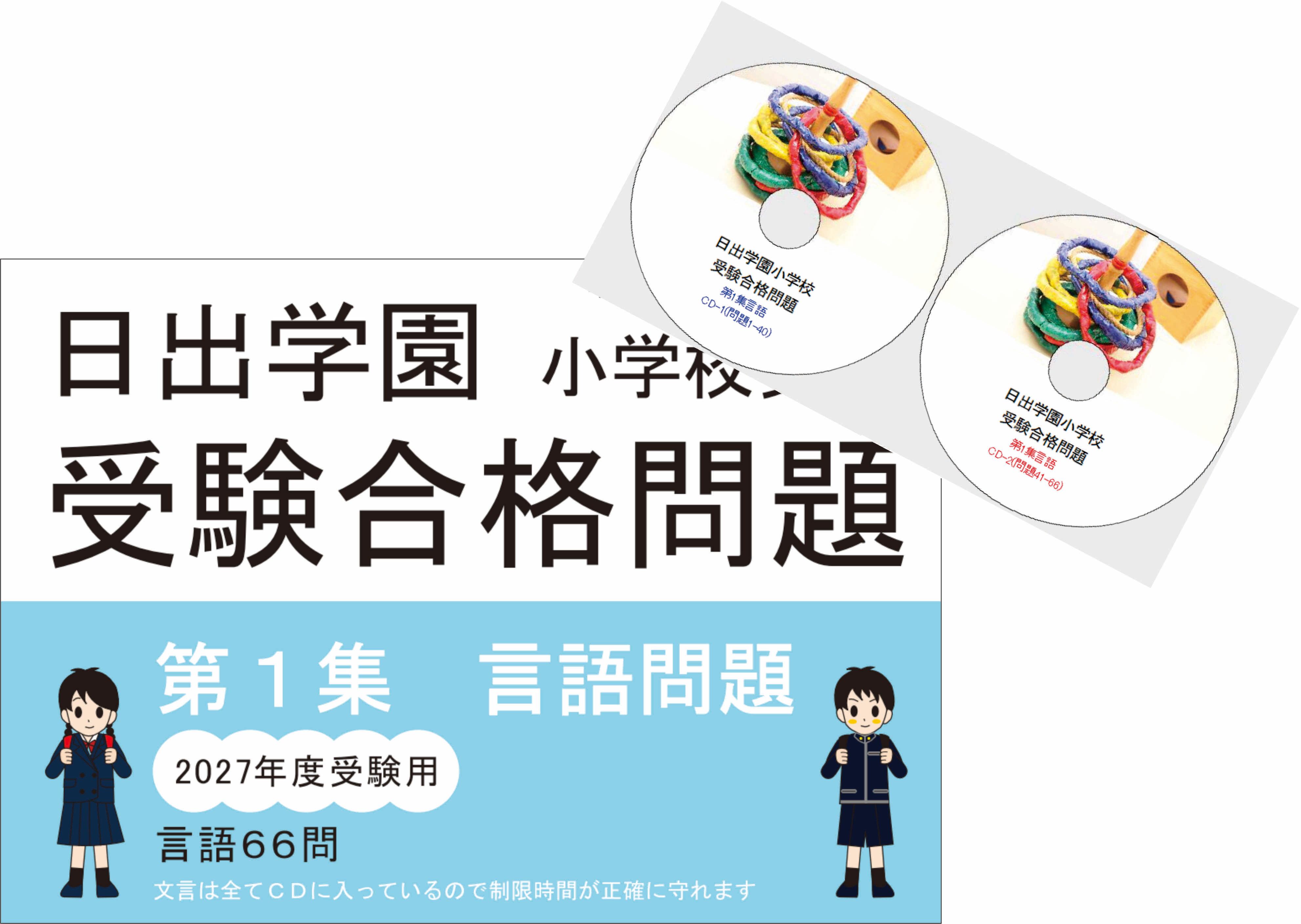 第1集「言語」は全66問でCDが2枚ついています。日出学園小学校では音の数・しりとり・音をつないで出来る言葉などがよく出題されます。