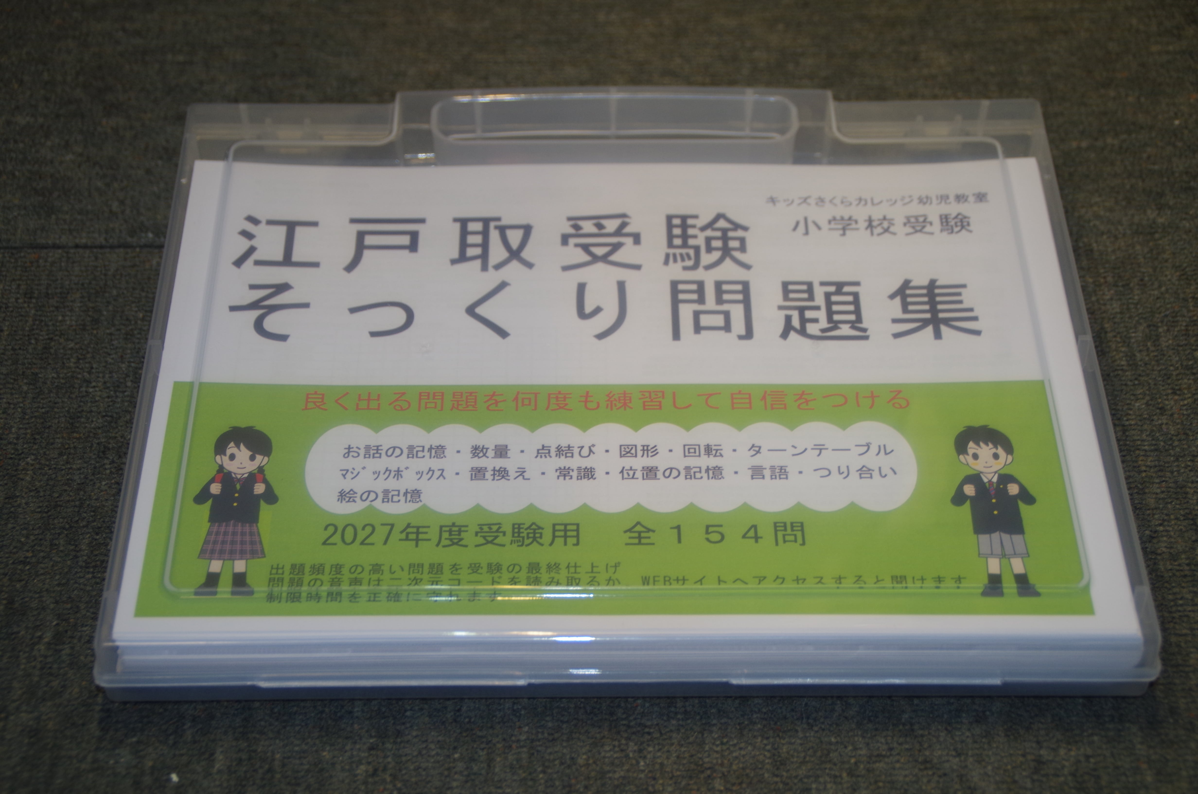 2027年度入試版は問題数を24枚増やしました。問題の領域は「お話の記憶・数える・合わせて10・同数発見・多少・組合せ・シーソー・点結び・重ね図形・四方見・回転・ターンテーブル(ルーレット)・マジックボックス・置き換え・位置の記憶・しりとり・同頭語・同尾語・常識・つり合い・絵の記憶」で、問題枚数は全154枚です。